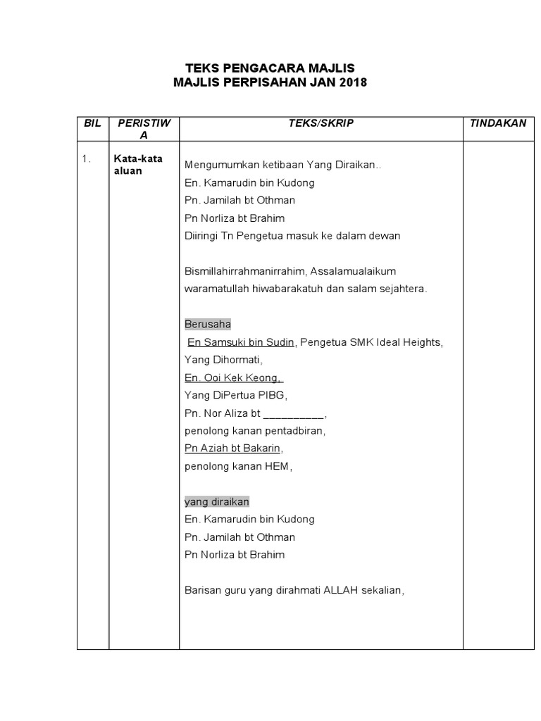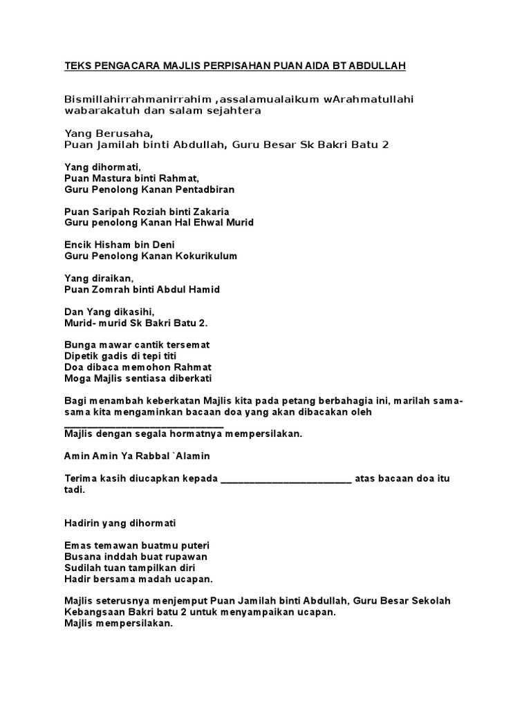 Contoh Teks MC Bagi Majlis Perpisahan. Doa Pembuka Majlis teks ucapan pengerusi majlis contoh mama planet chemical engineering kejuruteraan kimia teks pengacara majlis khatam al quran sk sahabat 16 jie jie melaka teks pengacara majlis untuk persaraan muzik utusan online kerengga aksara pengacara majlis majlis perasmian program minggu wan s. TEKS PENGACARA MAJLIS MAJLIS PERPISAHAN JAN 2018 BIL PERISTIWA TEKSSKRIP TINDAKAN 1.
